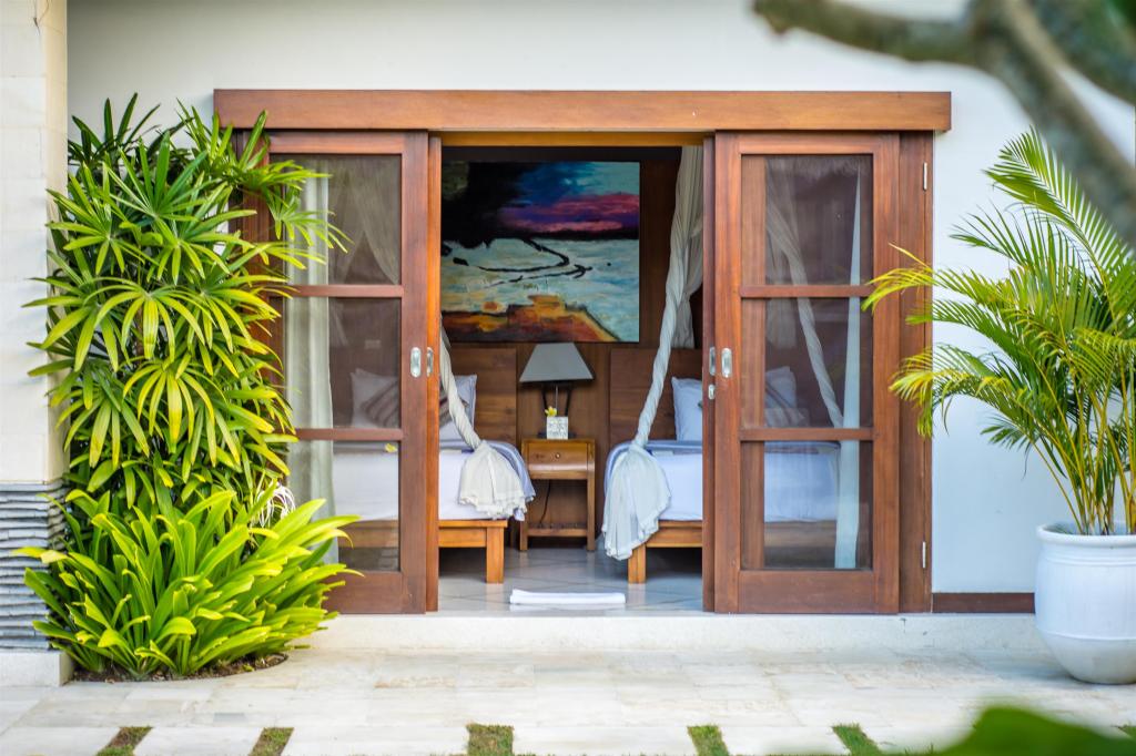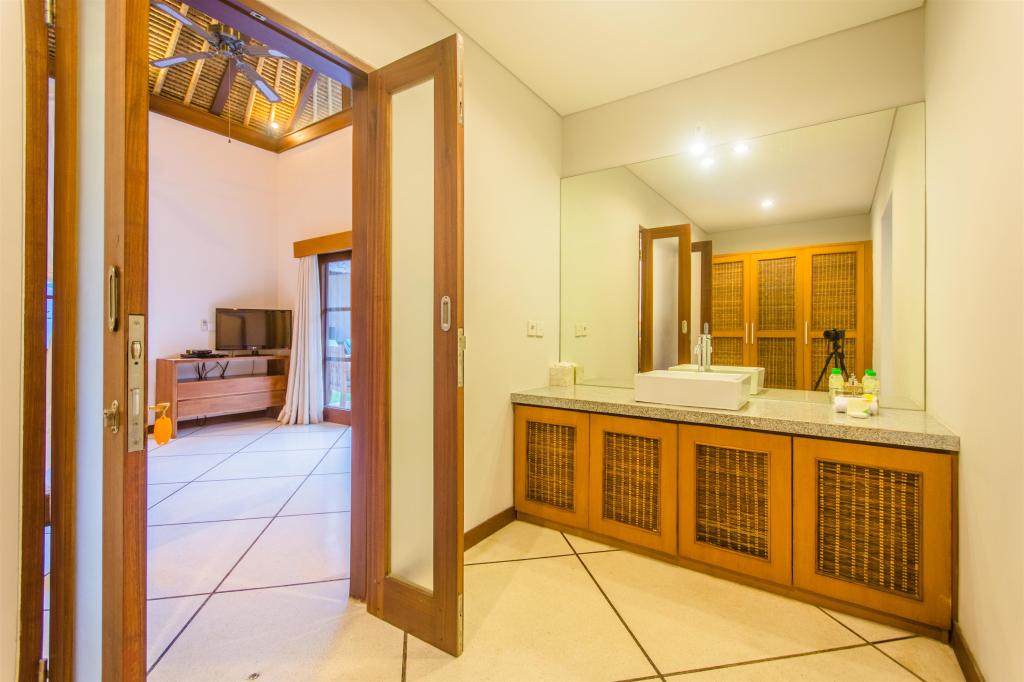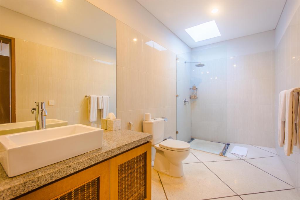 Flanked by two air-conditioned bedrooms, one have a double bed, another one with twin single beds that can be converted into a double bed, both have a safety deposit box in the wardrobe and stylish en – suite bathrooms with open shower and exclusive guest amenities and supplies. The master bedroom faces the gardens and pool and is comprised of a bedroom and elegant en-suite bathroom with bathtub and exclusive guest amenities and supplies.