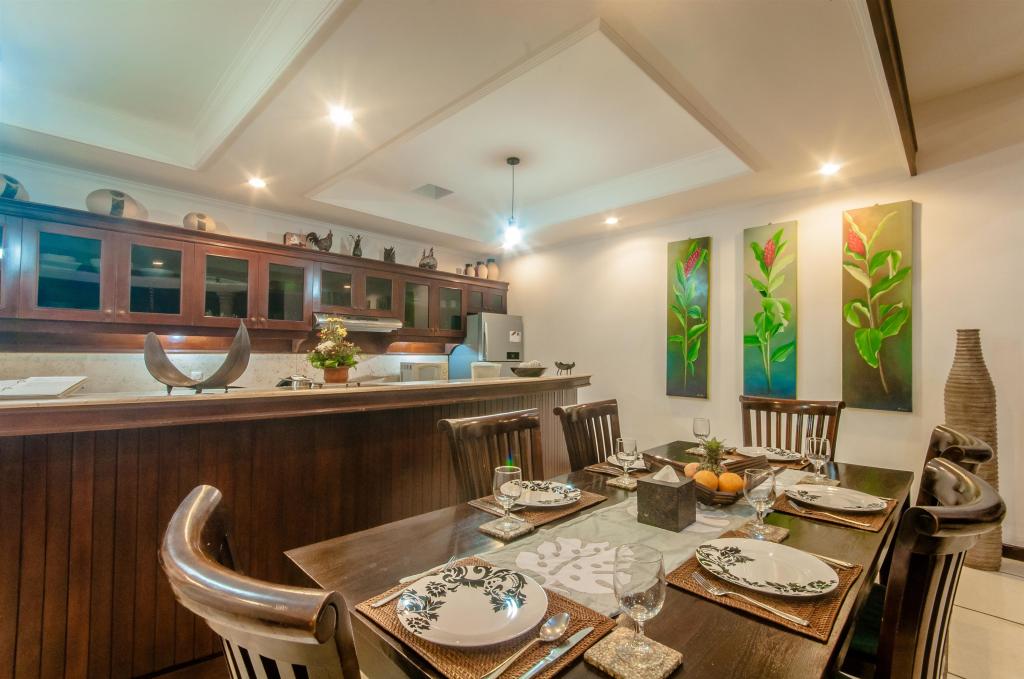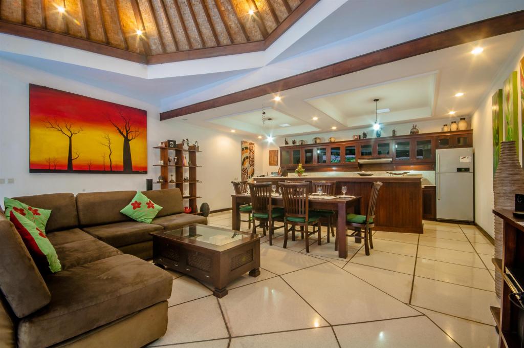 The main building is a beautifully decorated communal space with all the facilities you will need to enjoy a relaxing trip to Bali. Lying across the back of this main space is a spacious kitchen, with rich dark wood fronts. It is fully equipped with all appliances and utensils you may need to cook a group meal of an evening and enjoy dining together around the matching dark wood table which lies in front of the kitchen.