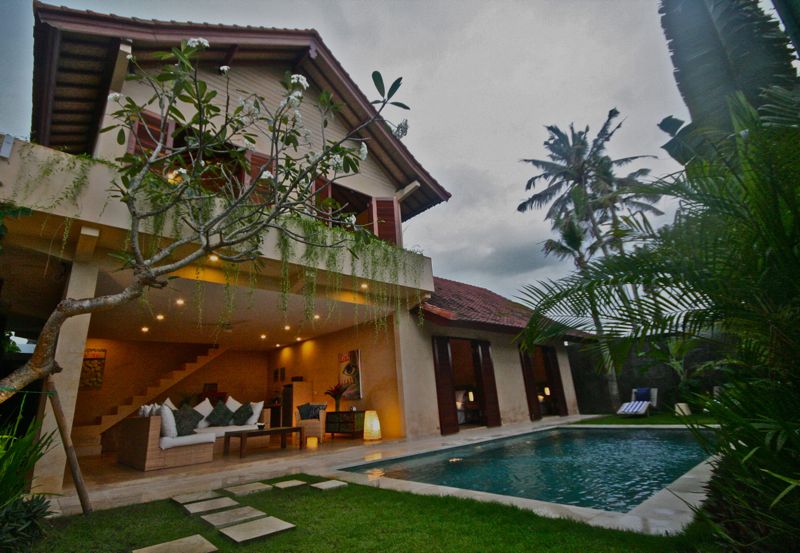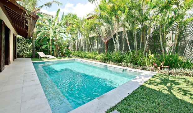 The villa overlooks a lush, tropical garden which includes a 6m x 4m pool, tiled with unpolished green/blue Bali stone reflecting the natural tones of the cream palimanan stone and white pebble surrounds.